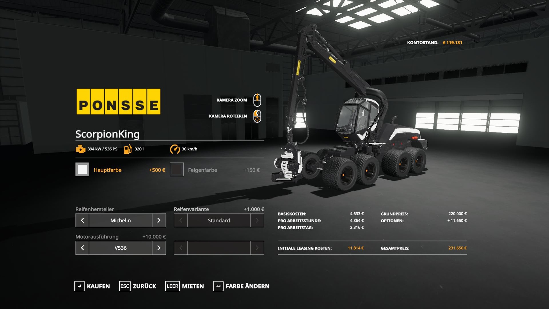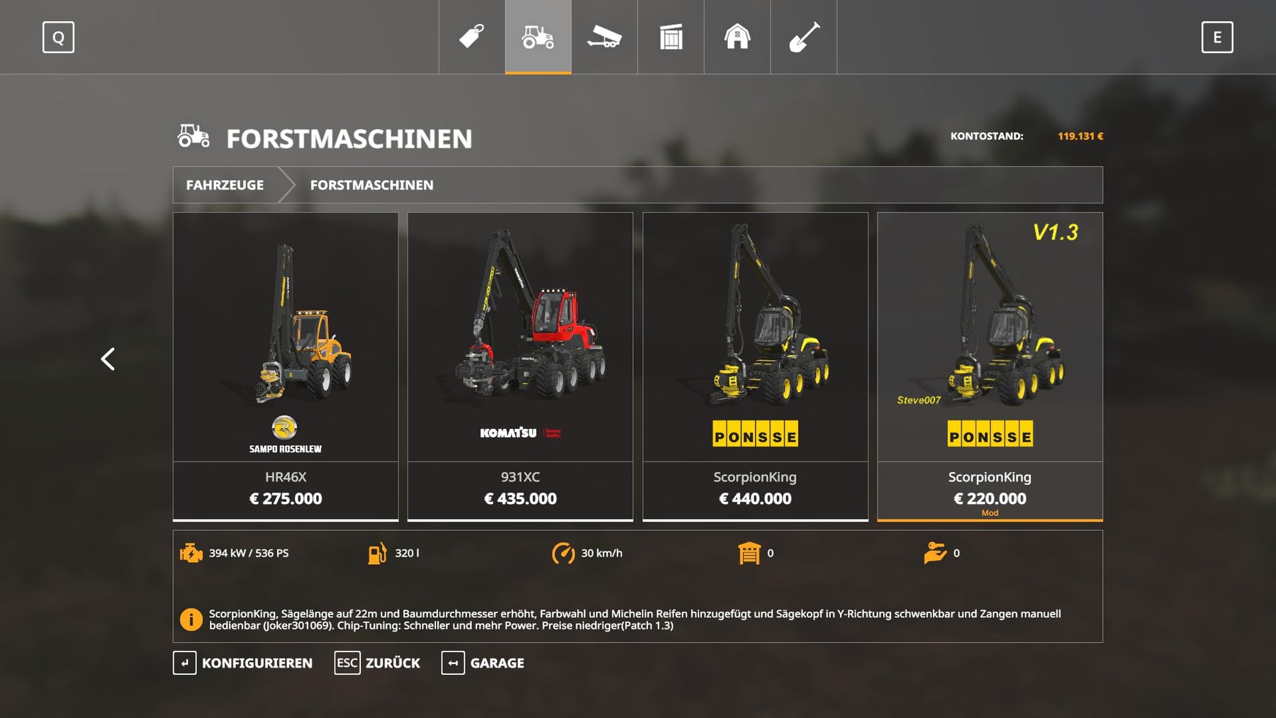 This is the standard FS 19 Ponsse ScorpionKing (GIANTS) with some modifications added: Ready for patch 1.3 by GIANTS Minimum patch 1.3 required! Credits: GIANTS , Steve007 |