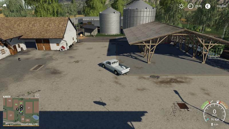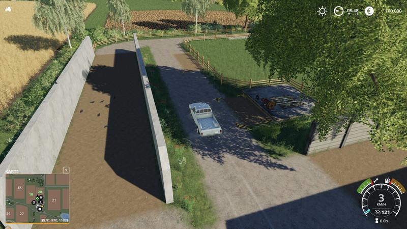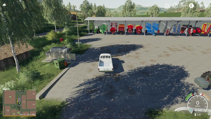 Have created a new parking space with shelters and filling stations in field 10 which was fitted into the landscape. At the top of fields 4 and 5 (which are not owned at the beginning) I have created a contractor farm with two large halls, two shelters, workshop, laundry and gas station.