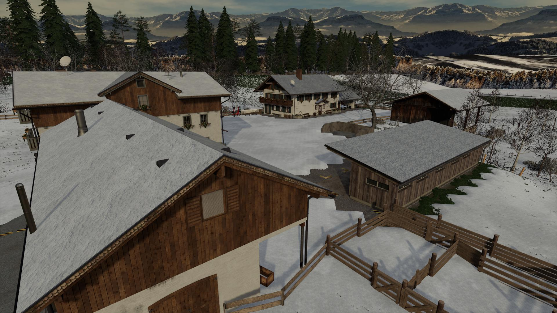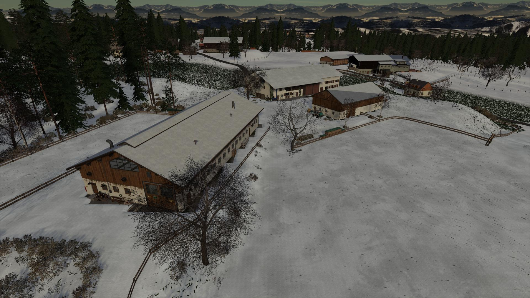 In winter, snow is falling on the roofs of all farm buildings.