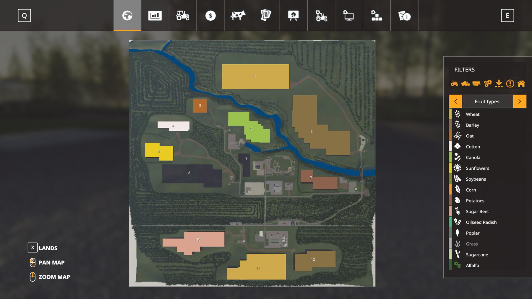 Fictional map Ready for the seasons. Have a geo There is a lot of space for animals and new fields. Steep hills Alfalfa crop added 12 fields
