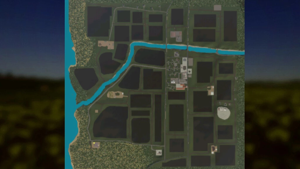 The map has 34 fields of various sizes, 5 farms, 2 places for placing objects, a BGA and several forest areas.
