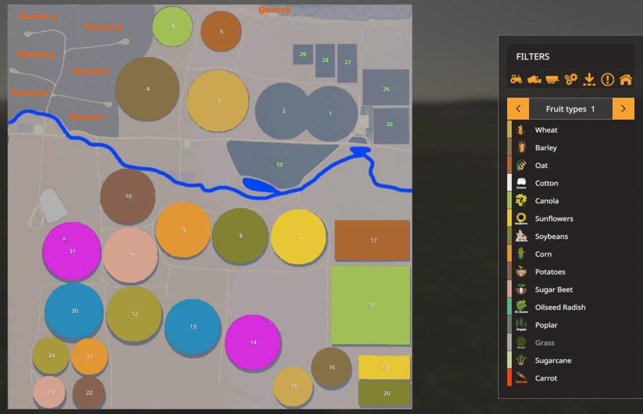 32 fields, 3 sell points, Animal Dealer, 6 forest areas, sawmill, BGA, New Holland Dealer, all the normal animal husbandry, 14 x extra multifruit, 1.2Mil liter potato storage and a huge array of startup fleet... Field sizes are: