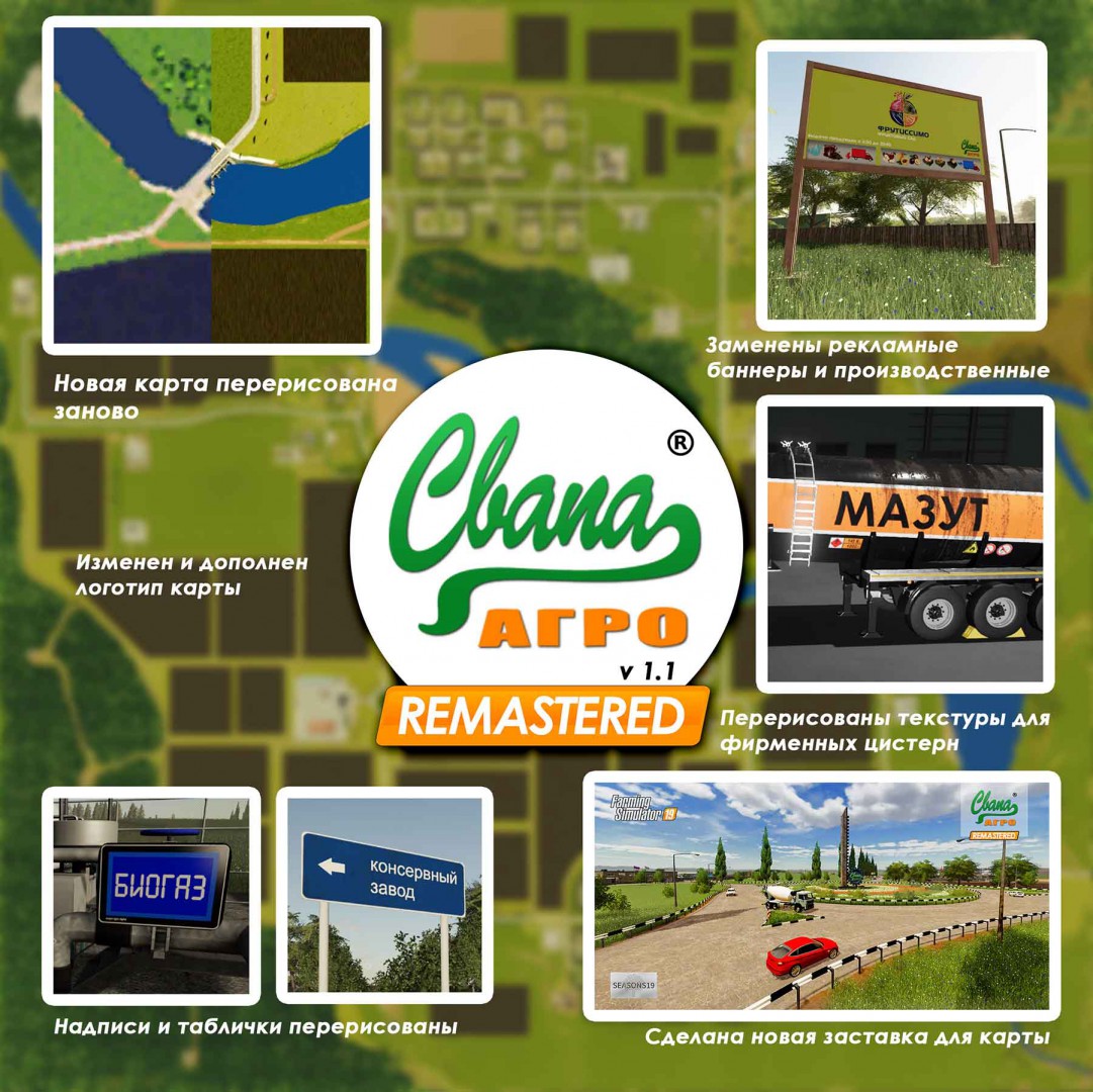 Mod SWAPA AGRO REMASTERED V1.1 for Farming Simulator 2019 Swap AGRO REMASTERED FS 2019 This is a redesigned famous map Swap Aggro 2.8.0. a little while ago, take a breath of fresh. Texts and design were changed: Labels and nadpisi. The text has become more and more developed, and the minimap has been developed and processed. It has now become more qualitative. Zagpuzochnaya kaptinka ctala bolee zhiznepadoctnoy and kachectvennoy, Pepepicovany tekctupy nA fipmennyx tsictepnax, Pepepicovany nekotopye poddony, Pepepicovany vce bannepy peped ppoizvodctvami nA bolee ctilnye, Pepepicovany peklamnye bannepy nA dopoge, Pepepicovan Univepmag, Dopicovany magaziny SP. V 1.1 Added by the completeness of the converted minimap. All products work as before. The mod "Global mod" is required. All rights to the card are subject to their respective auto circuits. Credits: Svapa Agro |