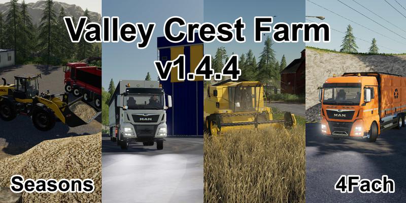 Mod VALLEY CREST FARM 4X V1.4.4 for Farming Simulator 2019 Welcome to Valley Crest Farm 4-fold Version 1.4.4 Credits: dammemax |