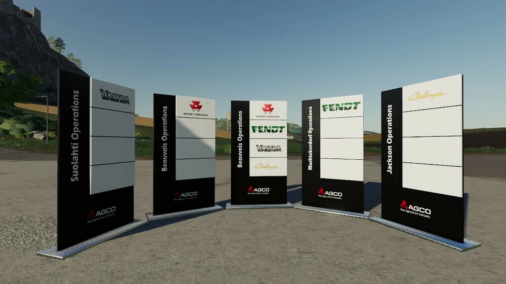 Mod AGCO Dealer Sign Pack v1.1.1.0 for Farming Simulator 2019 AGCO Dealer Label Pack Construction cost 1200 € Changelog 1.1.0.0 Added brand parameters (AGCO, Massey Ferguson, Fendt, Valtra, Challenger) Changelog 1.1.1.0 - Country / city names have changed depending on brands.