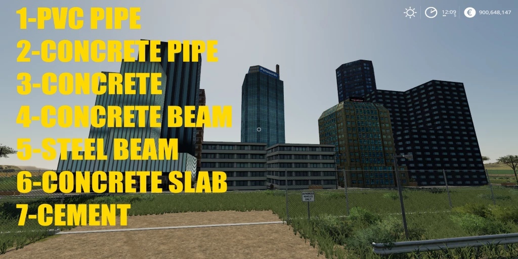 Mod BUILD A CITY 01 v1.0.0.0 for Farming Simulator 2019 With this mod you will build CITY 01 You have to play step by step ONE put 5 pallets of PVC 80,000 TWO put 5 pallets of concrete pipe 80,000 THREE put 160,000 concrete FOUR place 10 PALLETS OF CONCRETE BEAM = 160,000 FIVE put 10 pallets STEEL BEAM 160,000 SIX put 10 pallets of CONCRETE PLATE = 160000 SEVEN put 160,000 CEMENT Credits: TheSnake |