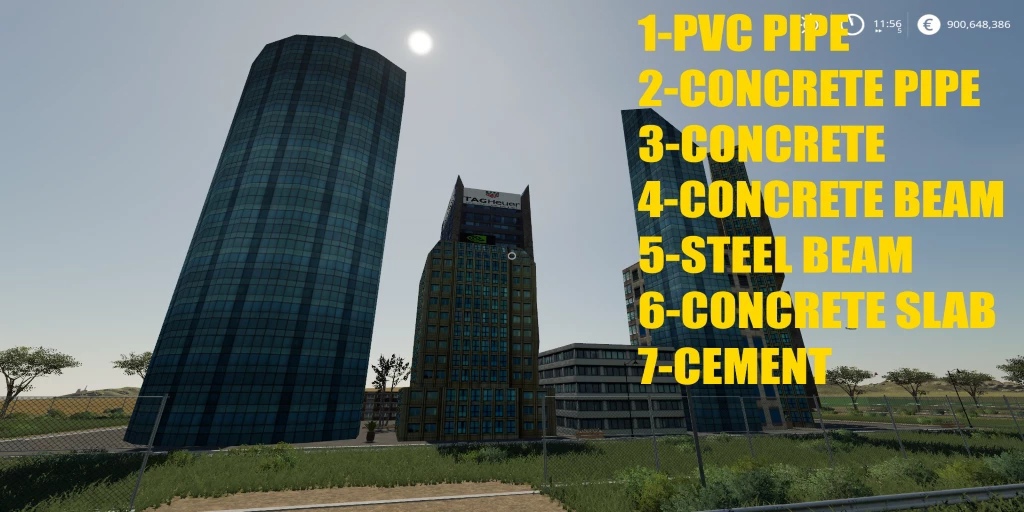 MOD BUILD A CITY 02 v1.0.0.0 for Farming Simulator 2019 With this mod you will build CITY 02 You have to play step by step 1 put 5 pallets of PVC 80,000 TWO put 5 pallets of concrete pipe 80,000 THREE put 160,000 concrete FOUR place 10 PALLETS OF CONCRETE BEAM = 160,000 5 put 10 pallets STEEL BEAM 160,000 SIX put in 10 Pallets of CONCRETE PLATE = 160,000 7 put 160,000 CEMENT Credits: GIANTS GC TheSnake |