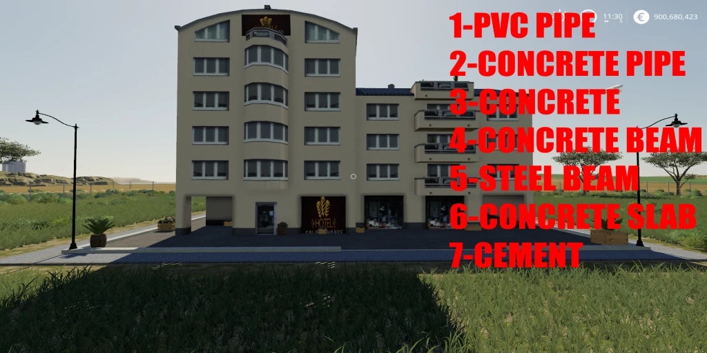 MOD BUILD A HOTEL 02 V1.0.0.0 FOR FARMING SIMULATOR 2019 With this mod you will build a HOTEL You have to play step by step 1 put 5 pallets of PVC 80,000 2 put 5 pallets of concrete pipe 80,000 3 put 160,000 concrete 4 put 10 PALLETS OF CONCRETE BEAM = 160000 5 put 10 pallets STEEL BEAM 160,000 6 invested 10 Pallets of CONCRETE PLATE = 160,000 7 put 160,000 CEMENT Credits: GIANTS GC TheSnake |