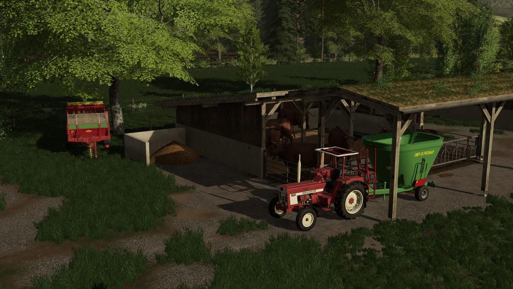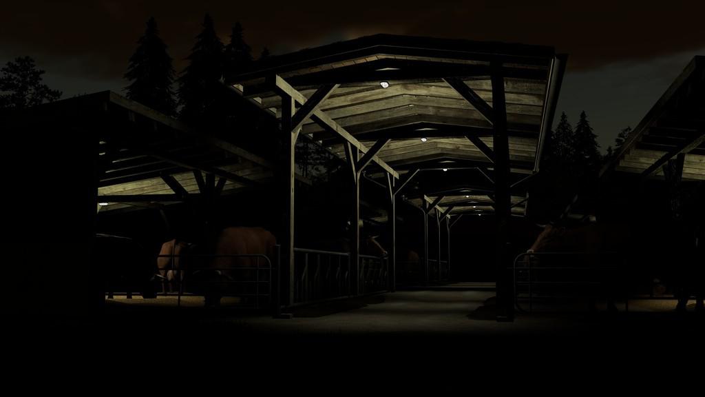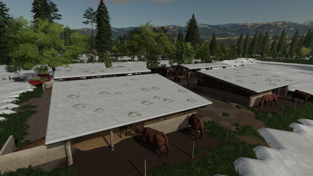 An open-air cowshed for small farmers. The mod contains two cowsheds: one with a covered aft alley and one without. If you use the PlaceAnywhere or Global Company mod, cows can be placed next to each other (see screenshots).