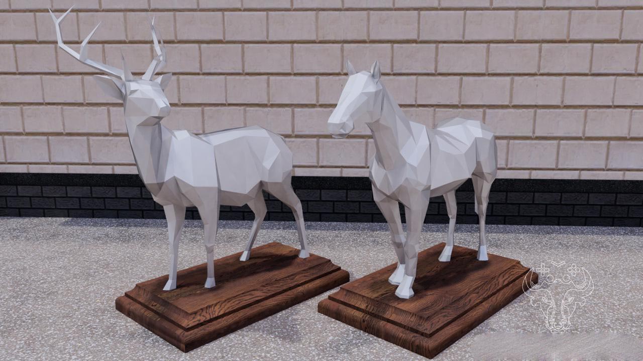 MOD DECORATIVE SCULPTURES V1.0.0.0 FOR FARMING SIMULATOR 2019 A set of decorative sculptures to decorate your farm Includes - Deer Sculpture - Horse sculpture Price: 2500 $ per piece