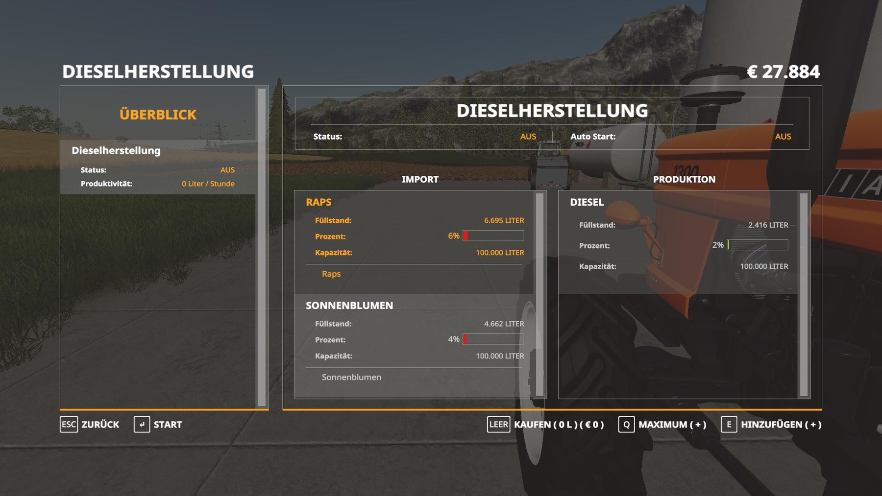 MOD DIESEL PRODUCTION WITH GLOBAL COMPANY V1.0.1 FOR FARMING SIMULATOR 2019 EN: In this factory, canola and sunflowers produce -> Diesel. Production / Hour: 1.000 Liter Required Inputs: Canola 60% and Sunflowers 40% Output: Diesel Information: Mod only playable in combination with GlobalCompany! Global Company Mod - LsModcompany / kevink98 - GtX - Eribus Modell - Giants Software Concept/Implementation - Der_Mali DE: Raps und Sonnenblumen produzieren in dieser Fabrik -> Diesel. Produktion / Stunde: 1.000 Liter Benötigte Rohstoffe: Raps 60% und Sonnenblumen 40% Produkt: Diesel Information: Mod nur in Verbindung mit GlobalCompany spielbar! Global Company Mod - LsModcompany / kevink98 - GtX - Eribus Modell - Giants Software Idee/Umsetzung - Der_Mali Credits: Der_Mali |