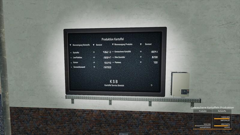 In this potato factory, potatoes are processed into 3 other products. These 3 products are premium potatoes, baked potatoes and french fries, which can then be sold at different locations / dealers. The acquisition cost of this building is € 175,000 and the daily running costs are € 500. It should be noted that other mods need to be added to manage this production, as empty pallets, cardboard and sunflower oil are required. For premium potatoes, you only need potatoes and empty trays. For baked potatoes, you need potatoes, empty trays, and cardboard. For fries, you will need potatoes, empty trays, cardboard boxes, and sunflower oil.