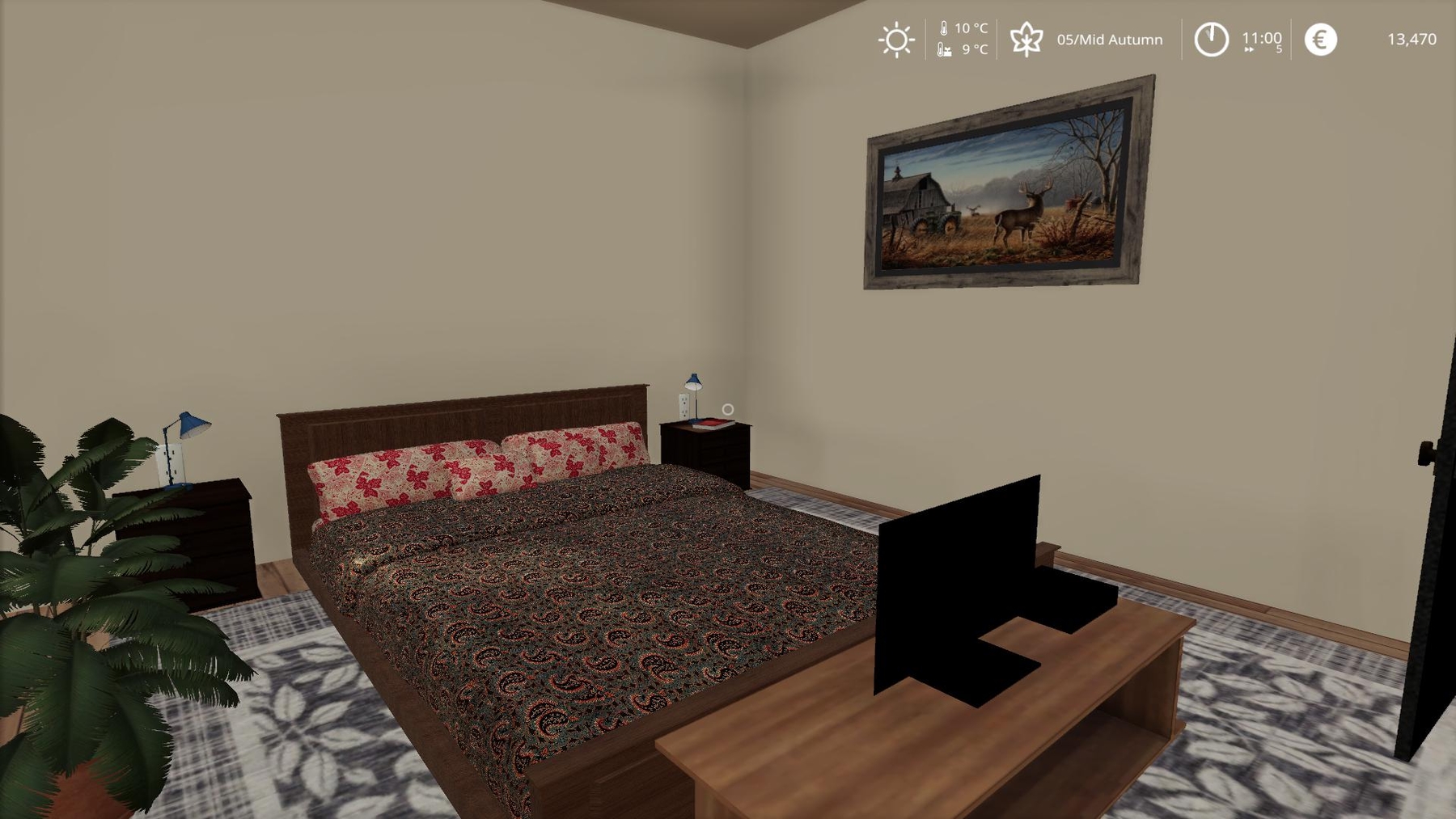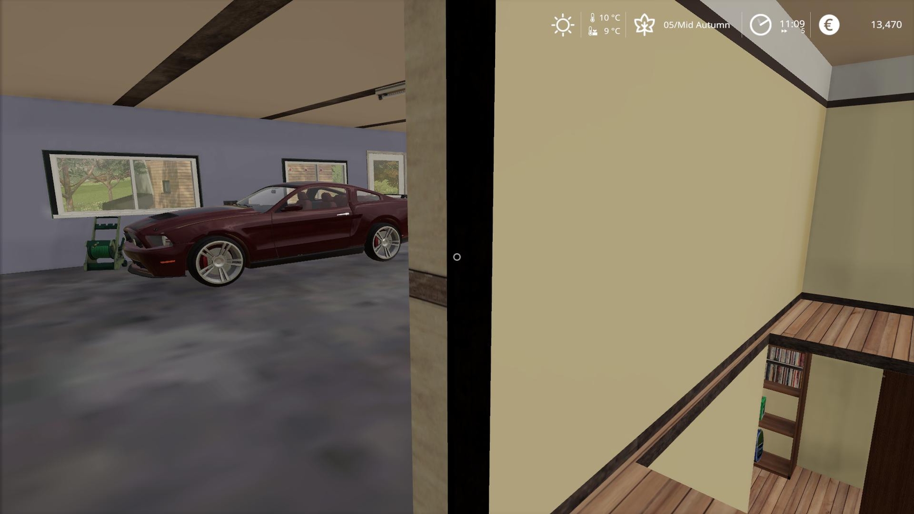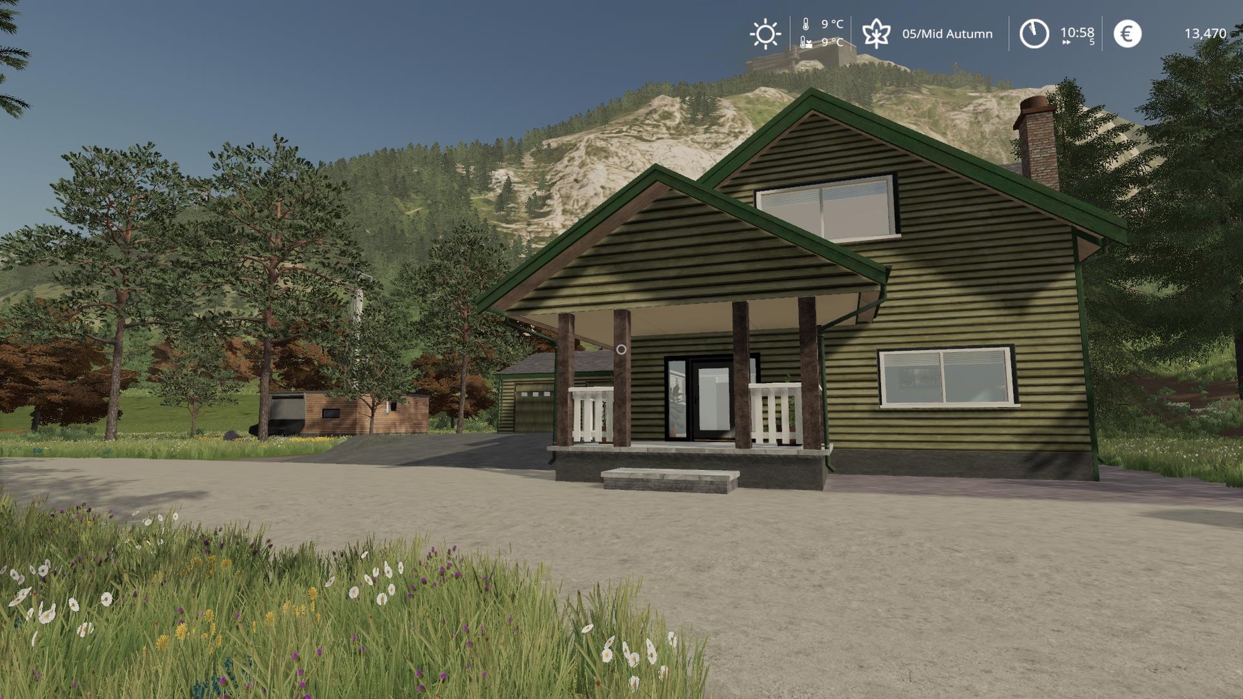Mod Farmhouse v1.7.1.0 for Farming Simulator 2019 Placed house. The house has 2 bedrooms, a kitchen, a living room, a laundry room, a storage room, a hall on 2 floors and a garage for 2 cars. -The sleep trigger is in the bedroom. Cost: € 180,000.