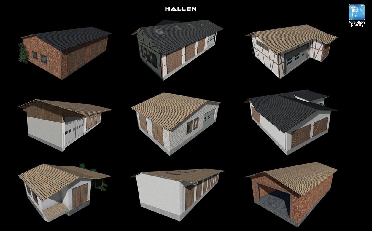 25 placeable buildings, halls, shelters, cowsheds, pigsties, BGA and workshops with lights and gates