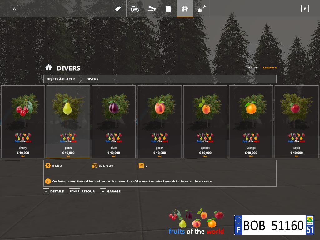 Mod FRUITS TREES BY BOB51160 V1.0.0.0 for Farming Simulator 2019 It's time to start your own garden, 7 fruit trees. These trees will be an hourly gain when you add water. By adding manure, you double your income, ensuring higher profits. Fruits are sold automatically every hour. The fruit is visible only when the water level is above 0. Income per hour: these figures will double when adding manure. Credits: BOB51160 / MAX51160 |