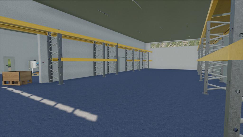 Description: High shelves along the side walls of the warehouse. The middle is free.