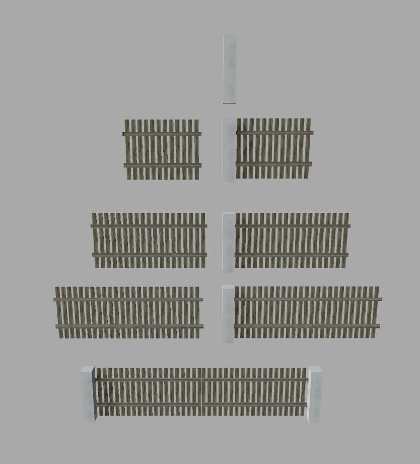 Set of fences: pole, gate, 2m fence with and without supports, 3m fence with and without supports, 4m fence with and without supports