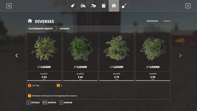 MOD MORE SHRUBS V1.0.1.0 FOR FARMING SIMULATOR 2019 Version 1.0.1.0 On demand more shrubs / bushes for LS19 to place Credits: -xaad- |