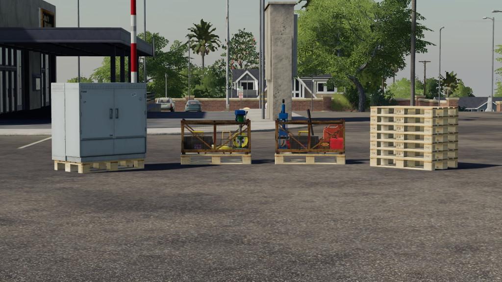 Mod Pallets Pack v1.0.0.0 for Farming Simulator 2019 This is a package of purchasable and resellable decorative pallets that you can take with a telescopic handler and attach it like a normal pallet. Credits: Sphinx |