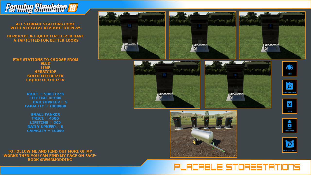This is a Placable Storetations Pack. In the pack, you will find a Seed Station, Lime Station, Herbicide Station, Solid Fertilizer Station, Liquid Fertilizer Station. ALL STORAGE STATIONS COME HERBICIDE & LIQUID FERTILIZER HAVE PRICE = 5000 Each SMALL TANKER Everything has been tested on and offline with no errors in the log. Credits: WMRmodding |