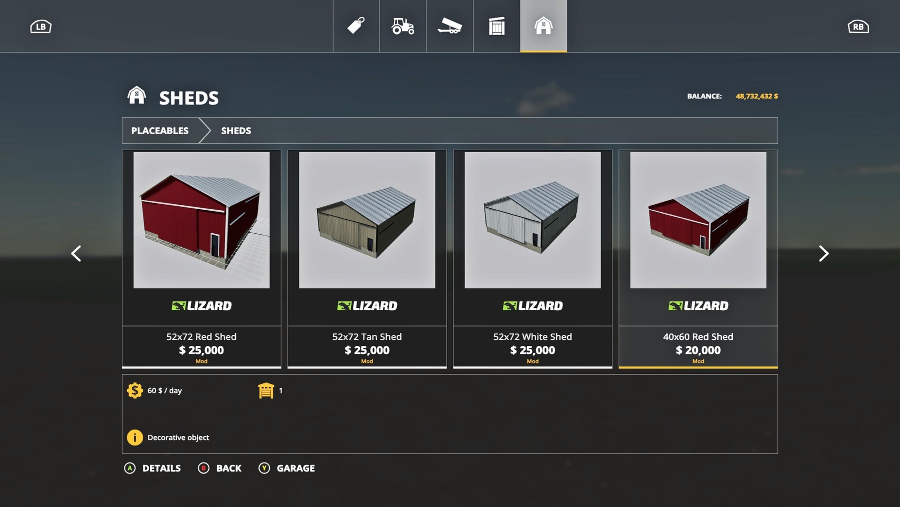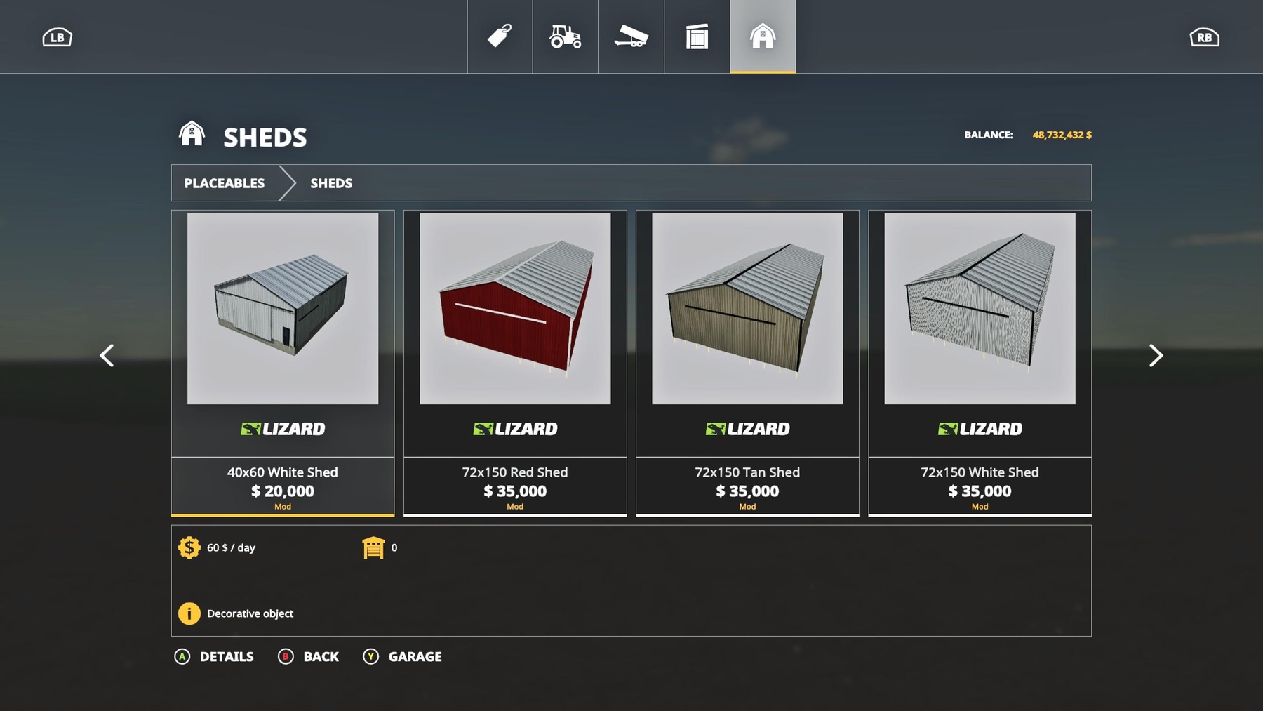 Hosted object Includes: 40x60 shop Quonset 40x60 barn 52x72 Shed 72x150 Shed All sheds have 3 color options: red, white and brown.