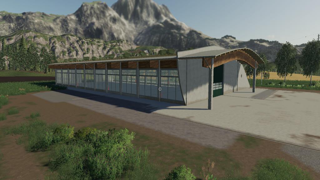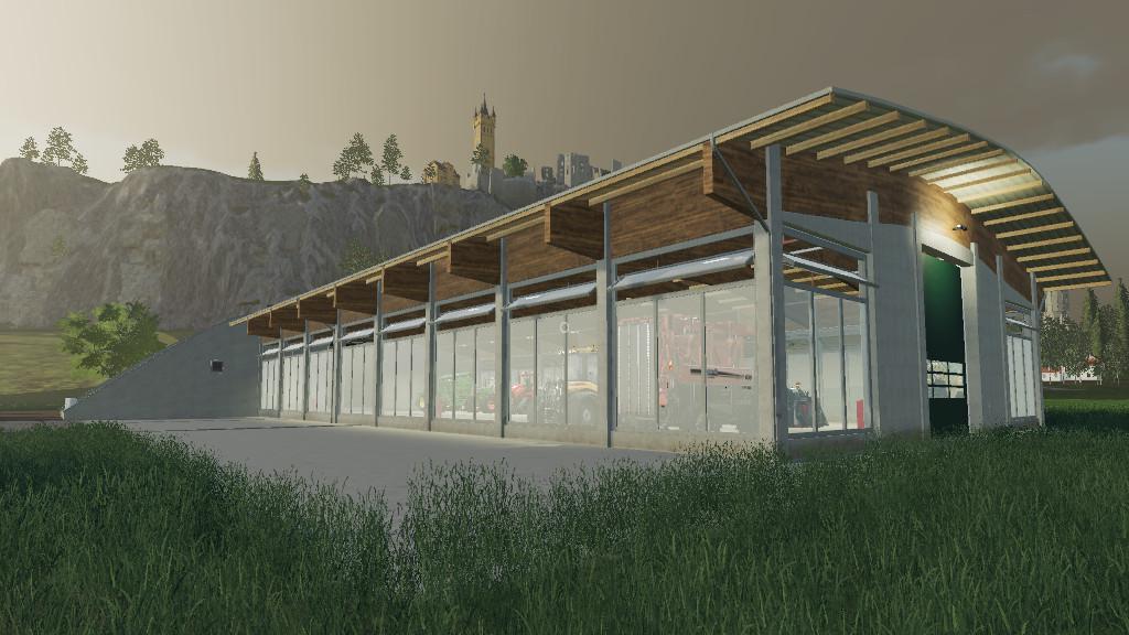 Mod ROOFGREENHALL V1.1.0.0 for Farming Simulator 2019 A large machine hall with dimensions of 30mx70m and two large gates of 7mx7m, it is suitable for storing vehicles and equipment, the windows can be opened. Credits: moechtegernbauer |
