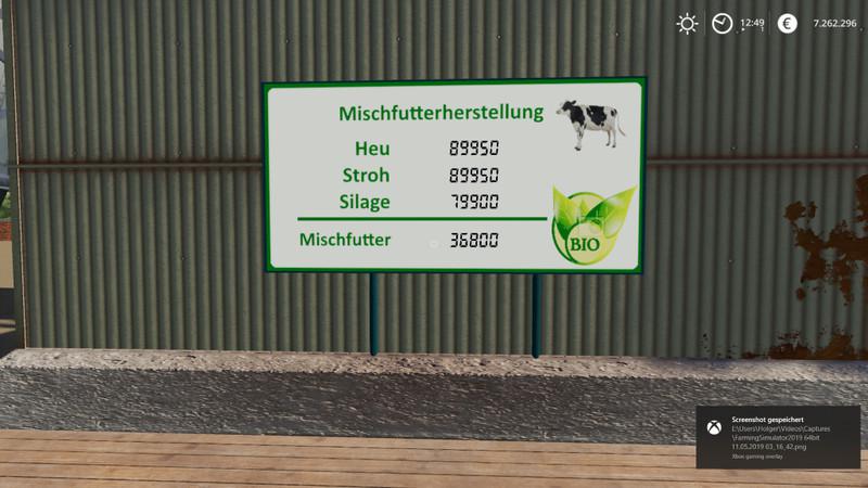 It is worthy of TMR production! Version 1.0.3.0 From 25% of straw, 25% of hay and 50% of a silo it is compound feed for cows. Production of animal feed can be found under the placed objects -> silos. The mod was tested in Singelplayer mode on my Frohnheim card and on Ravenport and without errors. The script is a new development for FS 19 and is now also extended to several types of filling for each raw material. The script generates some tips in the journal, for example, the current levels of feed production. Credits: Farmer_Schubi |