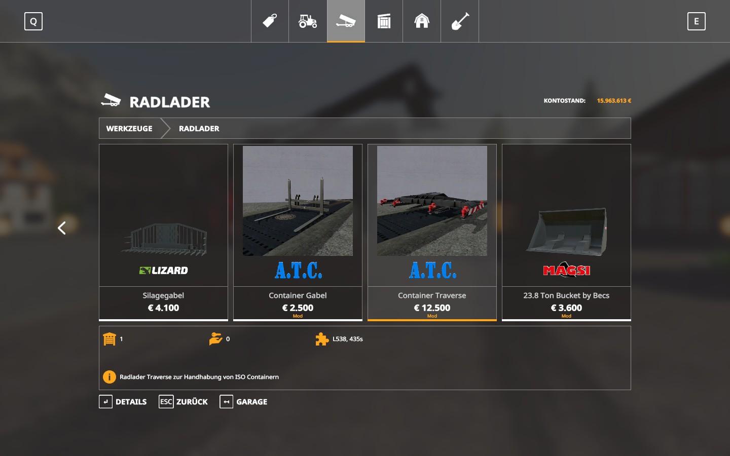 Container Fork and Traverse can be found in the category Tools / Wheel Loader
