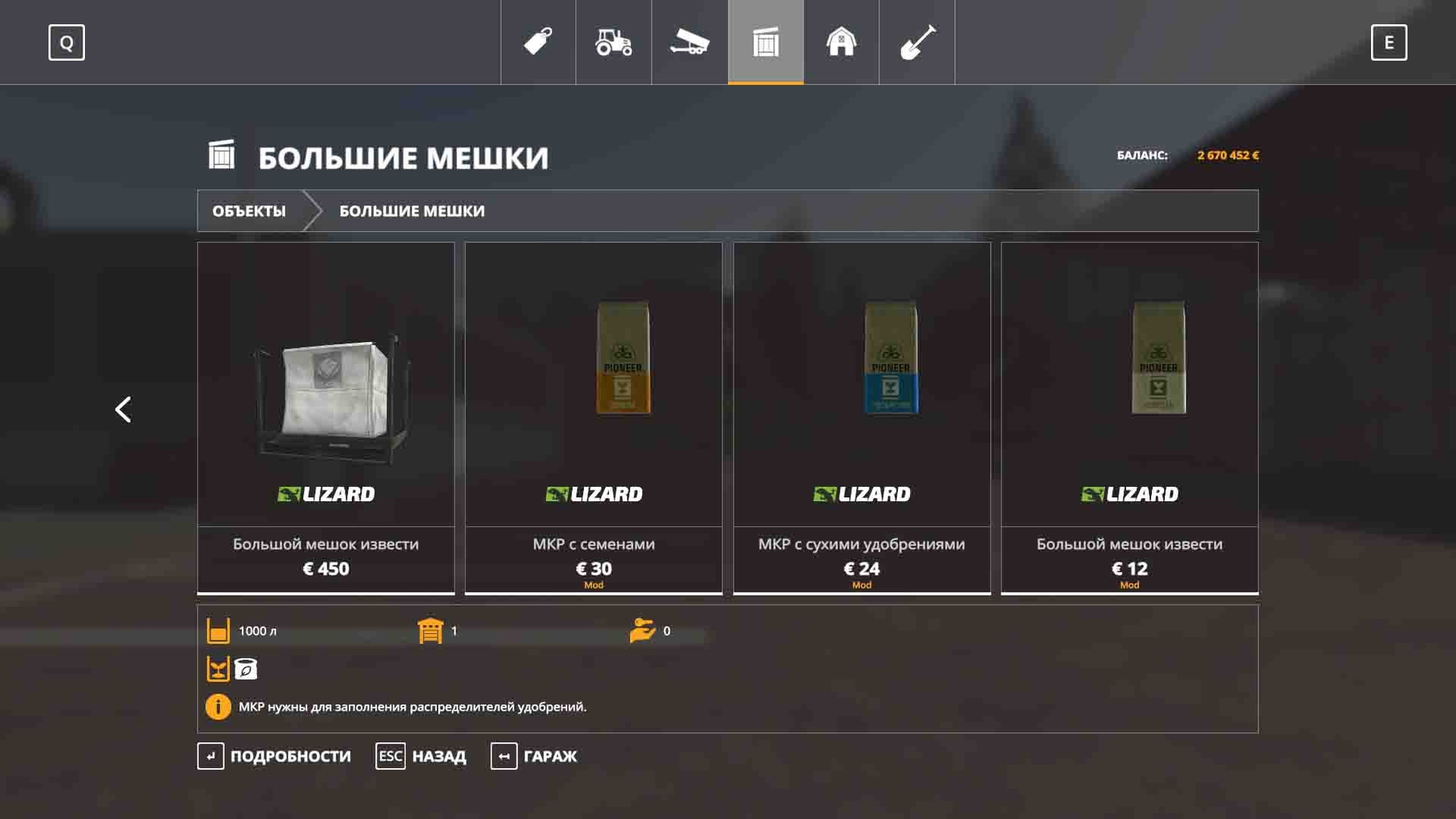 Mod BAGS OF SEEDS, FERTILIZERS AND LIME V1.0.0.0 for Farming Simulator 2019 Russified version of the mod "Pioneer Bags". The mod includes a set of bags of 50 liters. The contents of the bags: - Seeds; - Fertilizer; - Lime. Mod author: Norblin. Russification: Andrey Shishov.