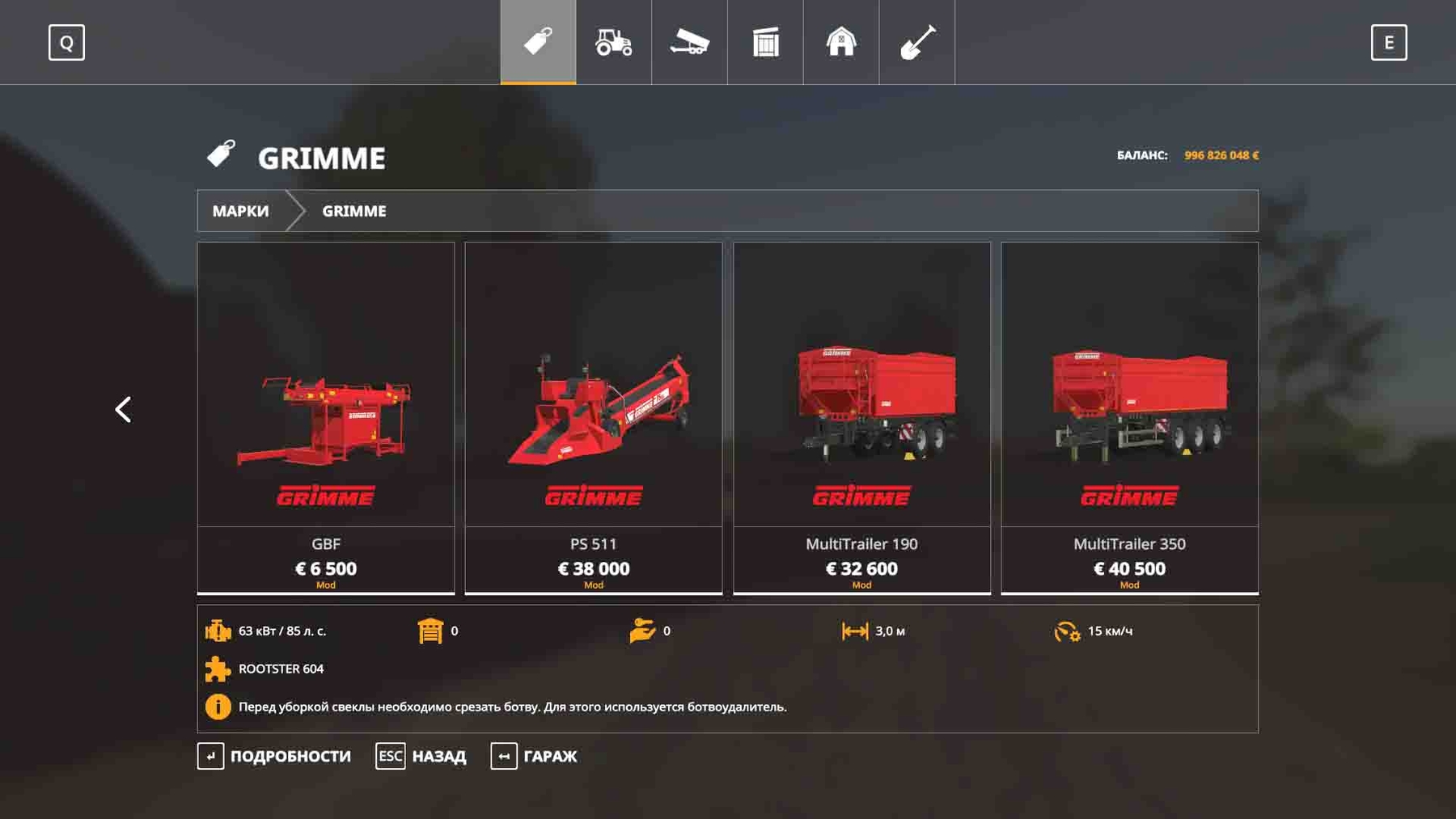 MOD DLC "GRIMME PACK" V1.0.0.0 FOR FARMING SIMULATOR 2019 This add-on contains 13 new tools from GRIMME and one additional tool from Lizard. - Cultivator GRIMME GH 2; - Cultivator GRIMME GH 4; - Cultivator GRIMME GH 8; - Potato planting machine GRIMME GL 32 E; - Potato planter GRIMME GL 32 F; - GRIMME WH 200 Eco potato harvester; - Potato harvester GRIMME WH 200 S; - Potato harvester GRIMME WR 200 CDW; - Potato harvester GRIMME SE 85-55; - Belt conveyor GRIMME GBF; - Belt conveyor GRIMME PS 511; - Trailer GRIMME MultiTrailer 190; - Trailer GRIMME MultiTrailer 350; - Sorting machine with a receiving hopper Lizard Conveyor Belt.