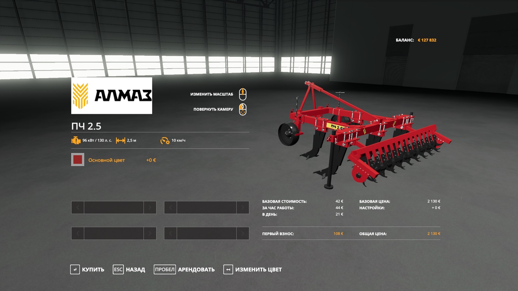 MOD IF 2.5 V1.0.0.0 FOR FARMING SIMULATOR 2019 - Cost: 2915 €; - Required power: 130 hp; - Working width: 2.5 m; - Working speed: 12 km / h; - Choice of the main color; - Choice of design color; - Gets dirty and washed; - The effect of wear (aging).