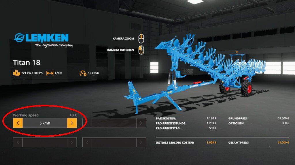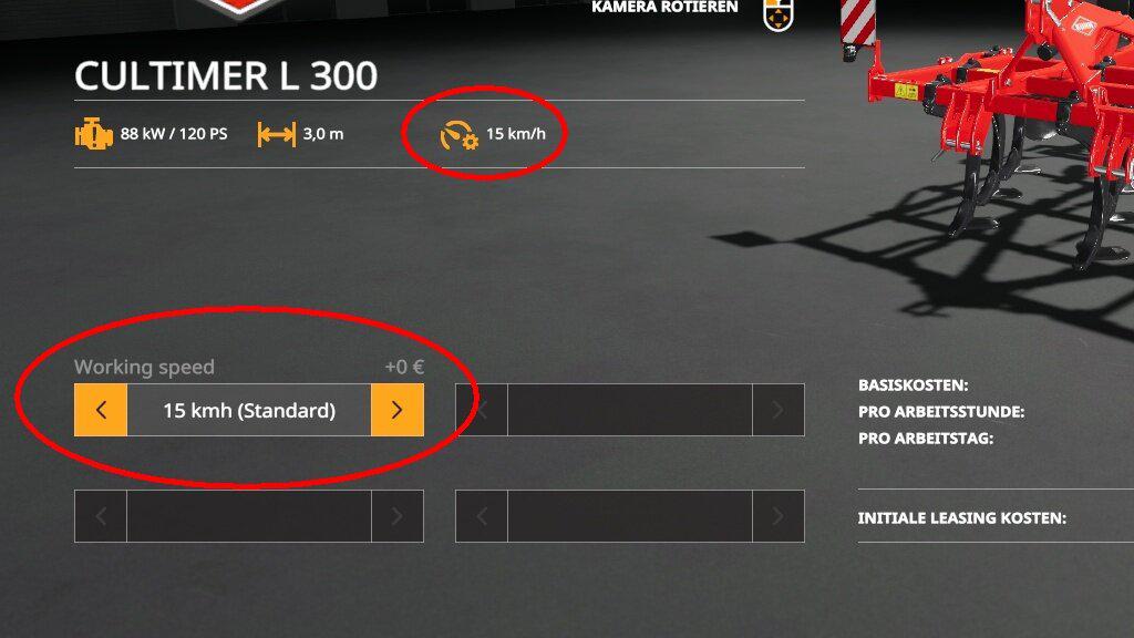 The implement speed can be set via Config, the setting range is up to 7 km / h more or less in 1 km / h steps, based on the standard value of the device.