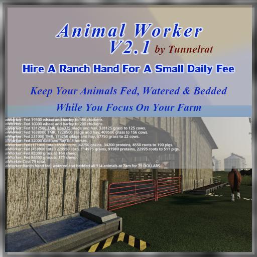 - New settings XML file in modsettings folder to configure animal worker is active, base price per animal (to feed) and fee.