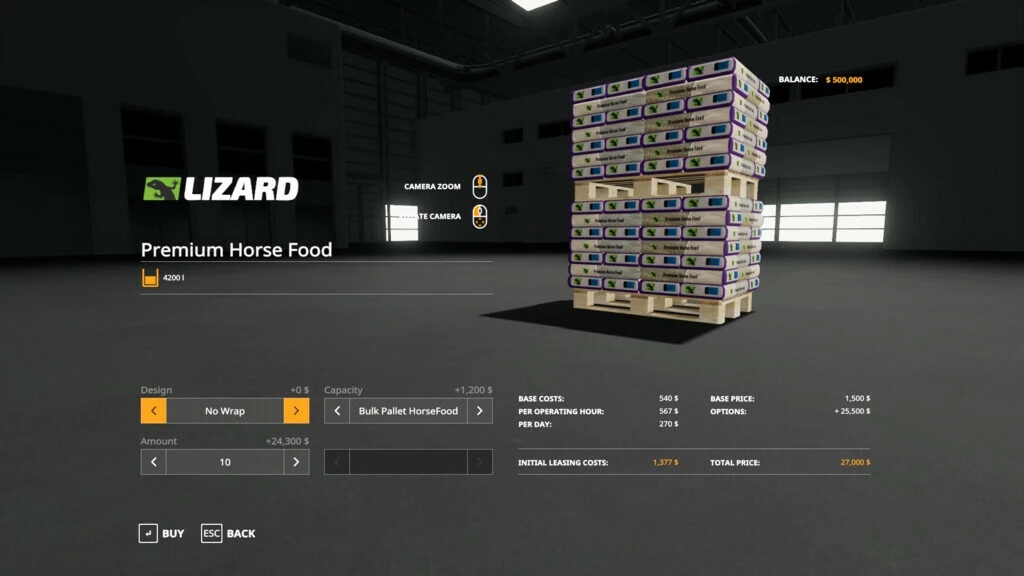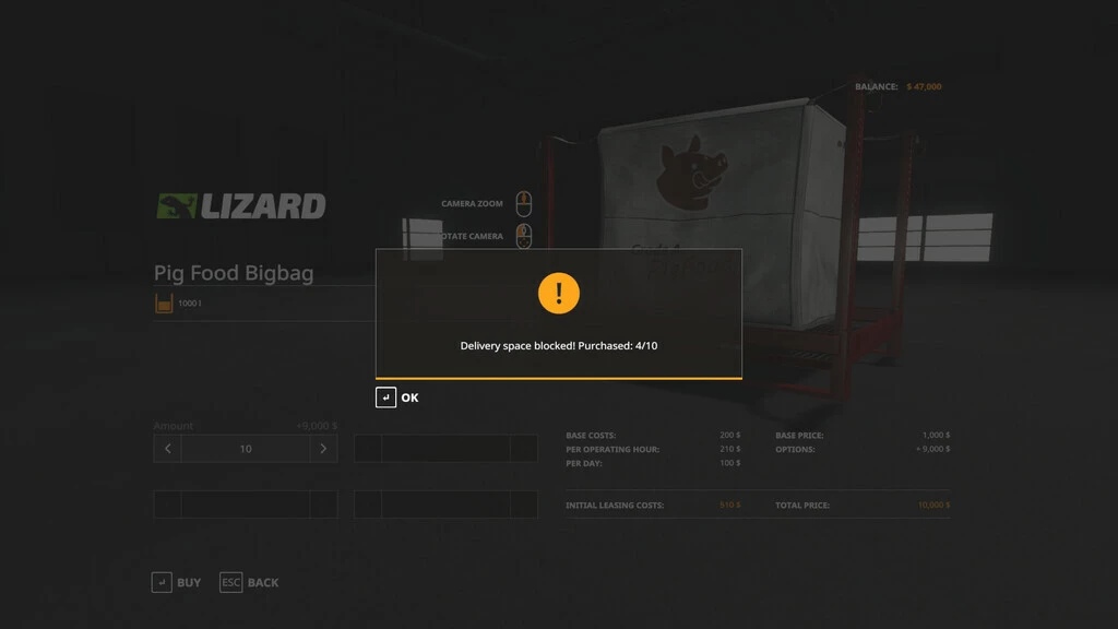 This mod allows you to purchase up to ten pallets or big bags from the store in one transaction. Please select the required amount before purchasing. If there is not enough space to deliver the full amount, you will only be charged for the items you received.