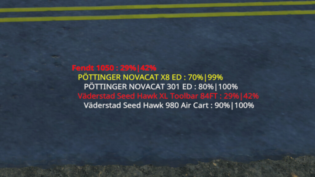 Hud shows the name, "short term wear" and "long term condition" of the current vehicle and each of the attached implements / tools.