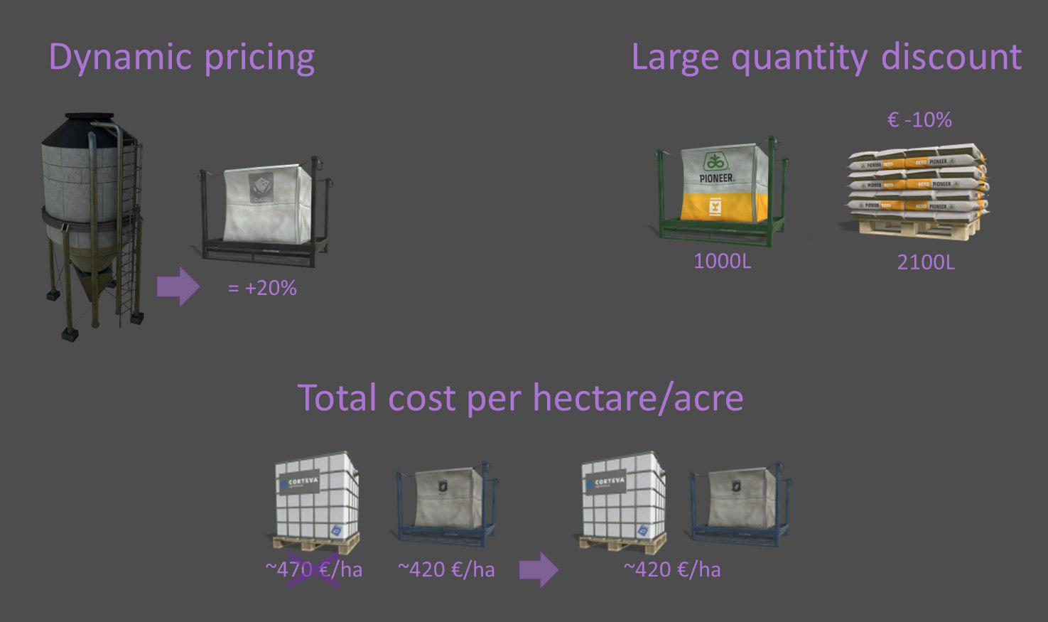 With the Pallet Price Balancer, pallet prices are no longer static and are now correctly matched to wholesale prices for each individual card. In addition, the price of liquid fertilizers per hectare is now balanced towards solid fertilizers.
