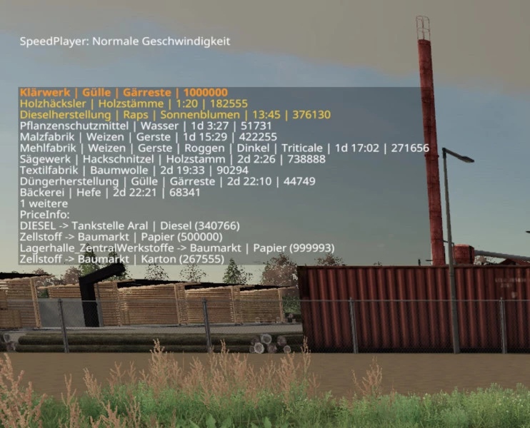The mod shows in the overlay production that does not use raw materials. Below are productions that will be empty for the next 72 hours and less than 75% full. Individual plays can be ignored using a settings file that is created when you save the game and which lists all plays. Sales opportunities are also shown, where goods from factories or warehouses can be sold at the best prices. But only if the Tunisian sales price trigger is installed and activated. In addition, there must be at least 100K Liters available in the warehouse or manufacturing facility, and the price specified in the sales price trigger must be exceeded.