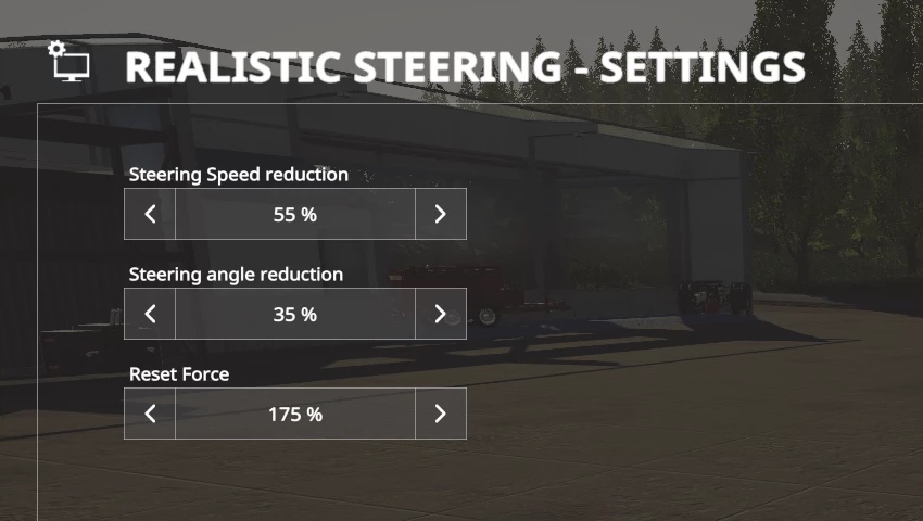 MOD Realistic Steering v1.0.0.0 for Farming Simulator 2019 This mod adjusts the speed and steering angle depending on the current vehicle speed. Thus, the tractor will be more responsive to road traffic, which will add a sense of control and realism to the simulation. The parameters can be customized to your liking in the game menu. Used with keyboard and gamepad. Do not use this mod when driving with wheels as it will cause steering lag. Credits: Balu |