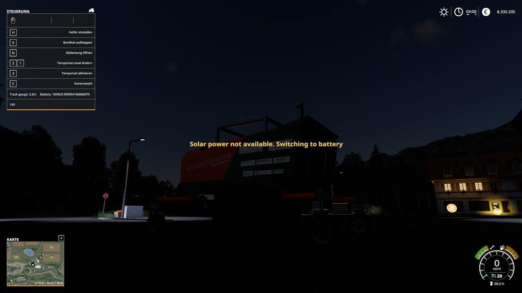 MOD SOLAR BATTERY SCRIPT V1.0.0.0 FOR FARMING SIMULATOR 2019 The script must be installed manually on cars! Adds the ability of the vehicle to work only with active solar energy, otherwise it switches to the battery. Instructions for changing the settings are in the lua file. Credits: HoFFi |