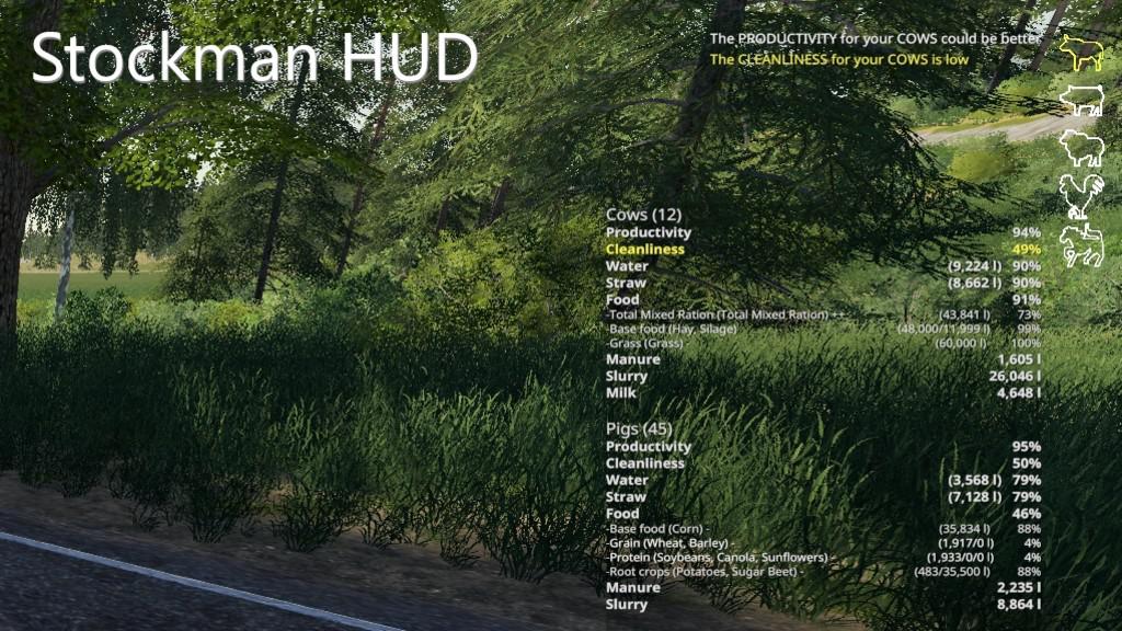 Stockman HUD gives you an overview of your animal husbandry with alerts and summaries for the most important stats.