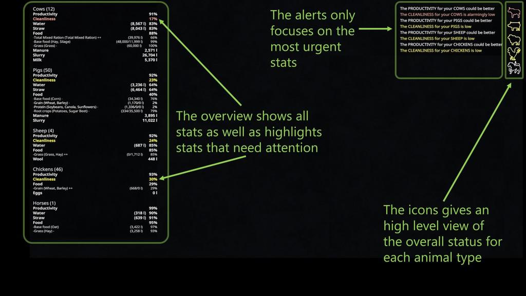 Stockman HUD gives you an overview of your livestock production with warnings and summaries for the most important statistics. The basic idea is to focus only on the information you need at the moment and highlight important statistics so you can effectively care for your livestock.