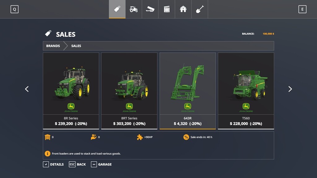MOD STORE SALES V1.0.1.0 FOR FARMING SIMULATOR 2019 This global script will add a new category to the Brands page of the store. Version: 1.0.1.0 The store will now randomly offer individual vehicles / tools or sometimes an entire brand at a reduced base price. Notifications will be displayed in the upper right corner of the screen when the sale starts. During "branded" sales, maps prepared for the mod will display discount signs and sale flags around the car store. Support for flags and signage has been added by default to the following giant-crafted maps: Map constructors: Credits: GtX |