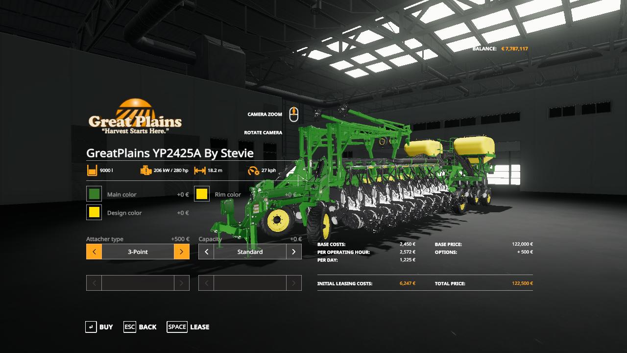 FS19 GreatPlains YP2425A By Stevie. Added colour options, fertilisation, direct planting, faster operating speed and beacon lights. Have fun with it.
