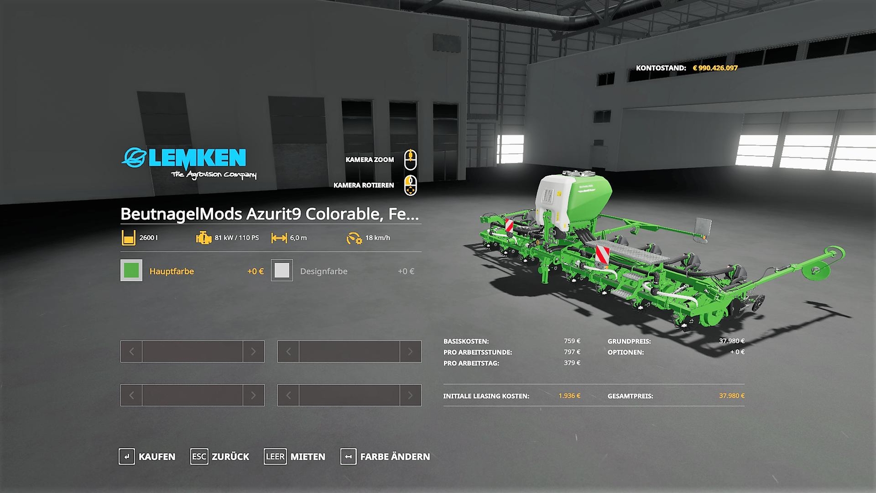 Lemken Azurit 9 Rebuilding with color choice of the body and lid, crop variety, direct sowing, volume increase Hello my dears, this is my first mod. It's the azurite 9, since I think it's cool except for the colors. Now it turned out at the color choice change, just a few things to join. The seeder now has: Credits: Stiffmeist79 |