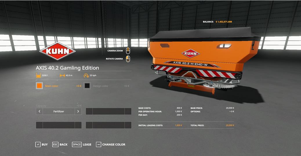 Kuhn Axis 40.2 Gamling Edition Working width: 42 meters Version 1.0.0.4 Version 1.0.0.3 Version 1.0.0.2 Version 1.0.0.1 Credits: GIANTS Software | Gamling |