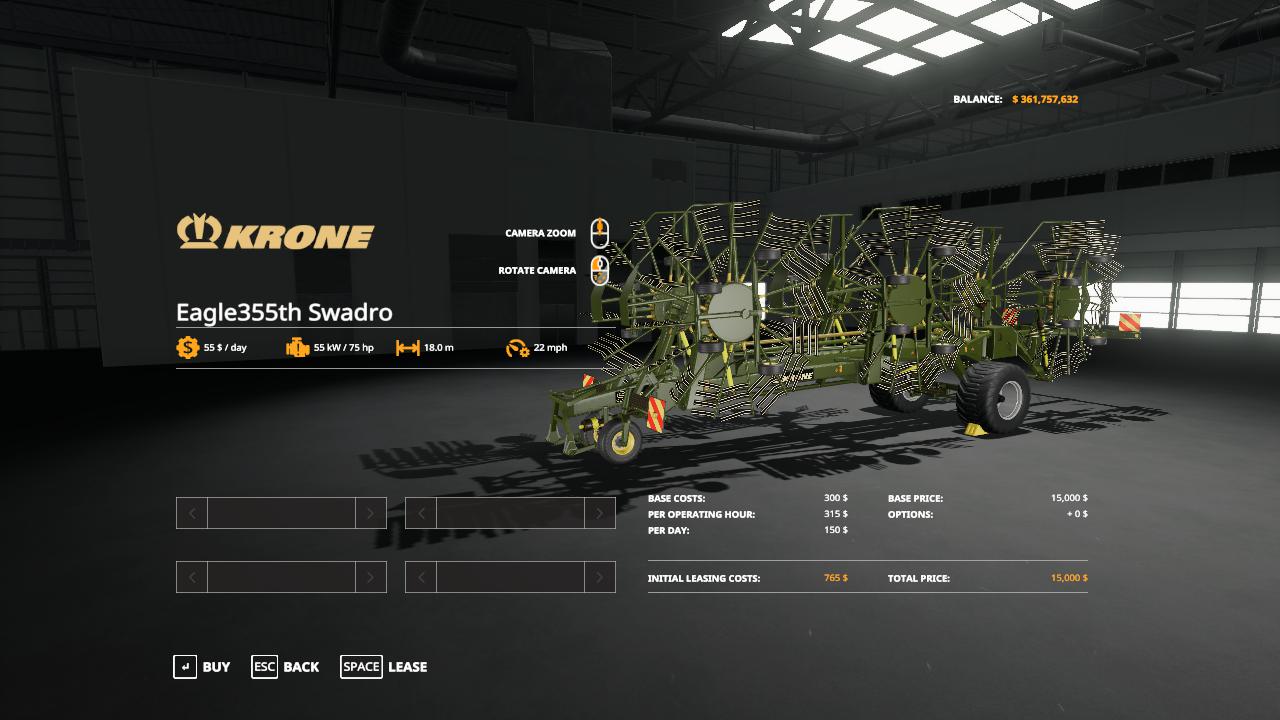 Eagle355th Swadro for FS 19 Roll width 18 meters Required power 110l.s. Soiled and washed! The log is clean!