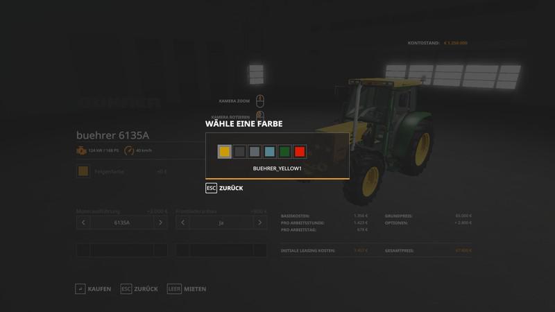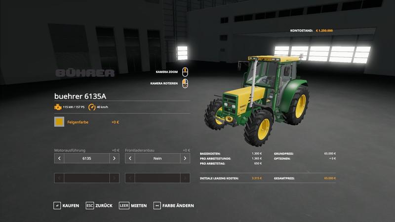 MOD BUHRER 6135 A V1.3.0.0 FOR FARMING SIMULATOR 2019 This is a Bührer 6135 A with a front loader made of LS13 from an unknown original manufacturer, new connecting hoses and various refinements. Version 1.3.0.0 Price: Bührer 6135: 65,000 €, 157 HP Price: frame color: 150 € Price: Choice of design: 1000 € Price: Tire selection: 1000 € - 6000 € Credits: Giants Software, Imperon |