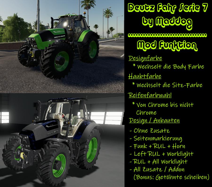 Mod Deutz Fahr Serie 7 v1.0.0.0 for Farming Simulator 2019 main color Choice of tires by color Design / Attachments Credits: Giants Software, Maddog |