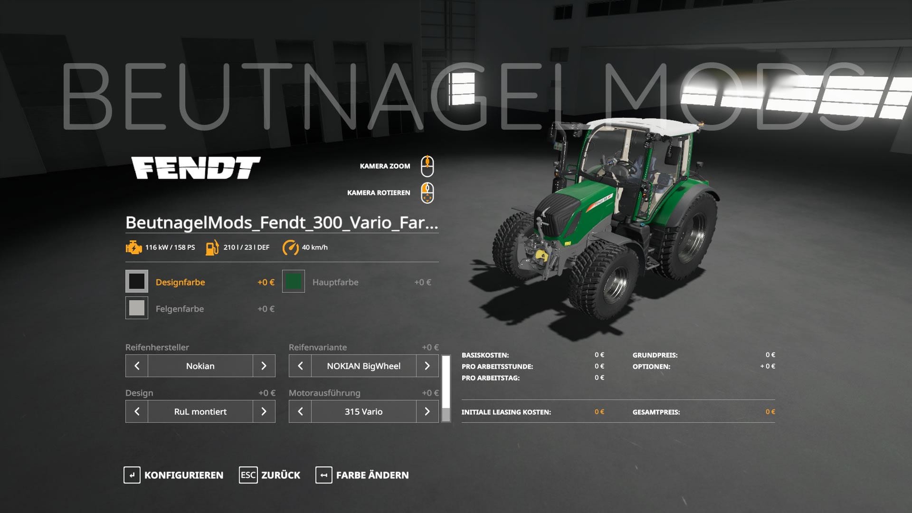 This is my FENDT 300 Vario with SuperConfig with lots of nice new gimmicks, like Choice of color, 7 x Motorconfig, various tire combinations (Mitas MONSTER), rotating beacon as selection, number plates etc. Version 1.0.0.5 Credits: Stiffmeist79 |