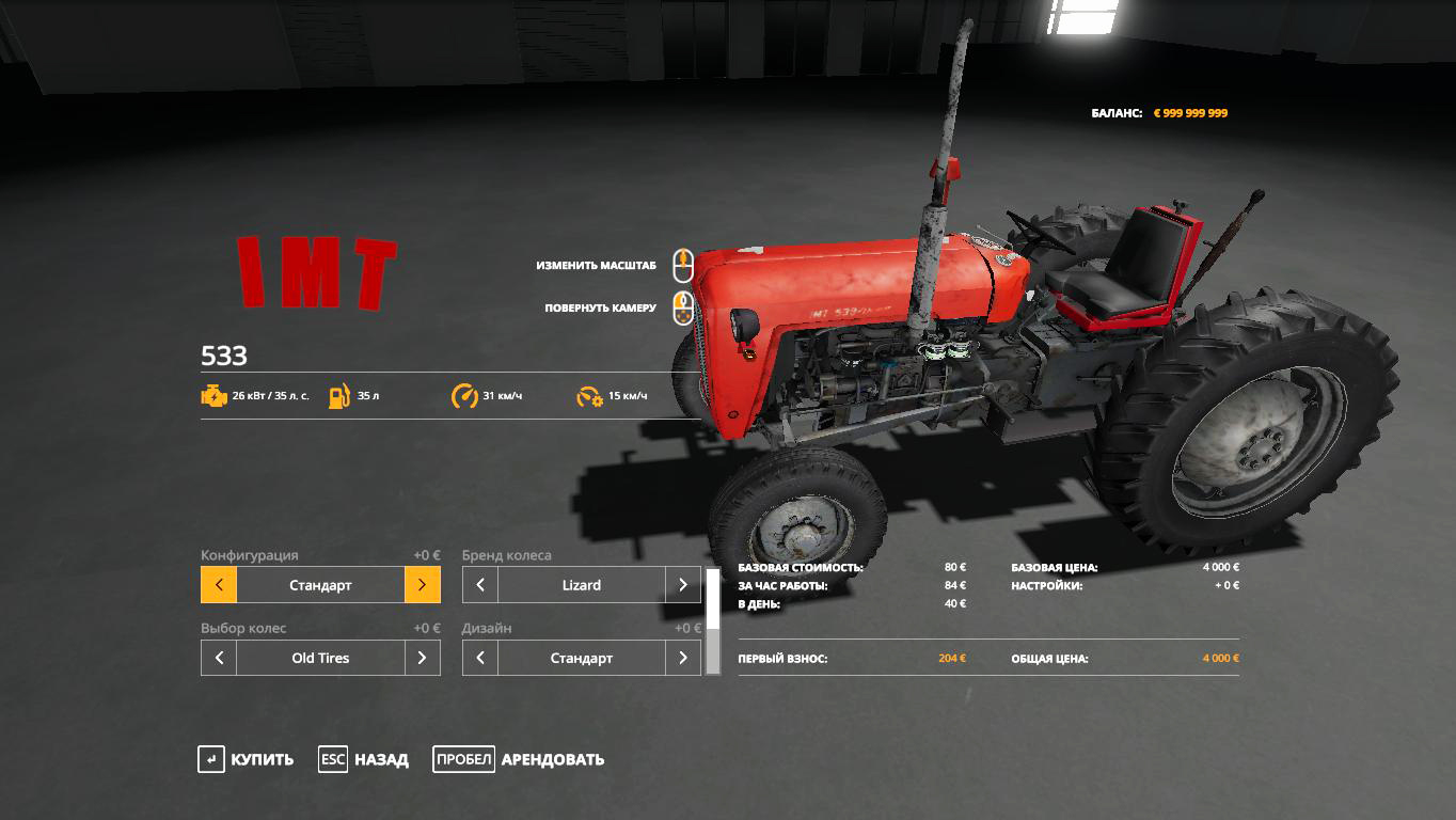 MOD IMT 533 V1.0.0.0 FOR FARMING SIMULATOR 2019 Power: 35 l / s, speed: 31 km / h. Choice of configuration, choice of design, choice of wheels, choice of headlights (standard, yellow). Mower installation, front loader console. IC: doors, rear window, bonnet, bonnet cover. Animation of tidy, fan, levers and pedals. Dynamic hoses, lighting technology, washable.